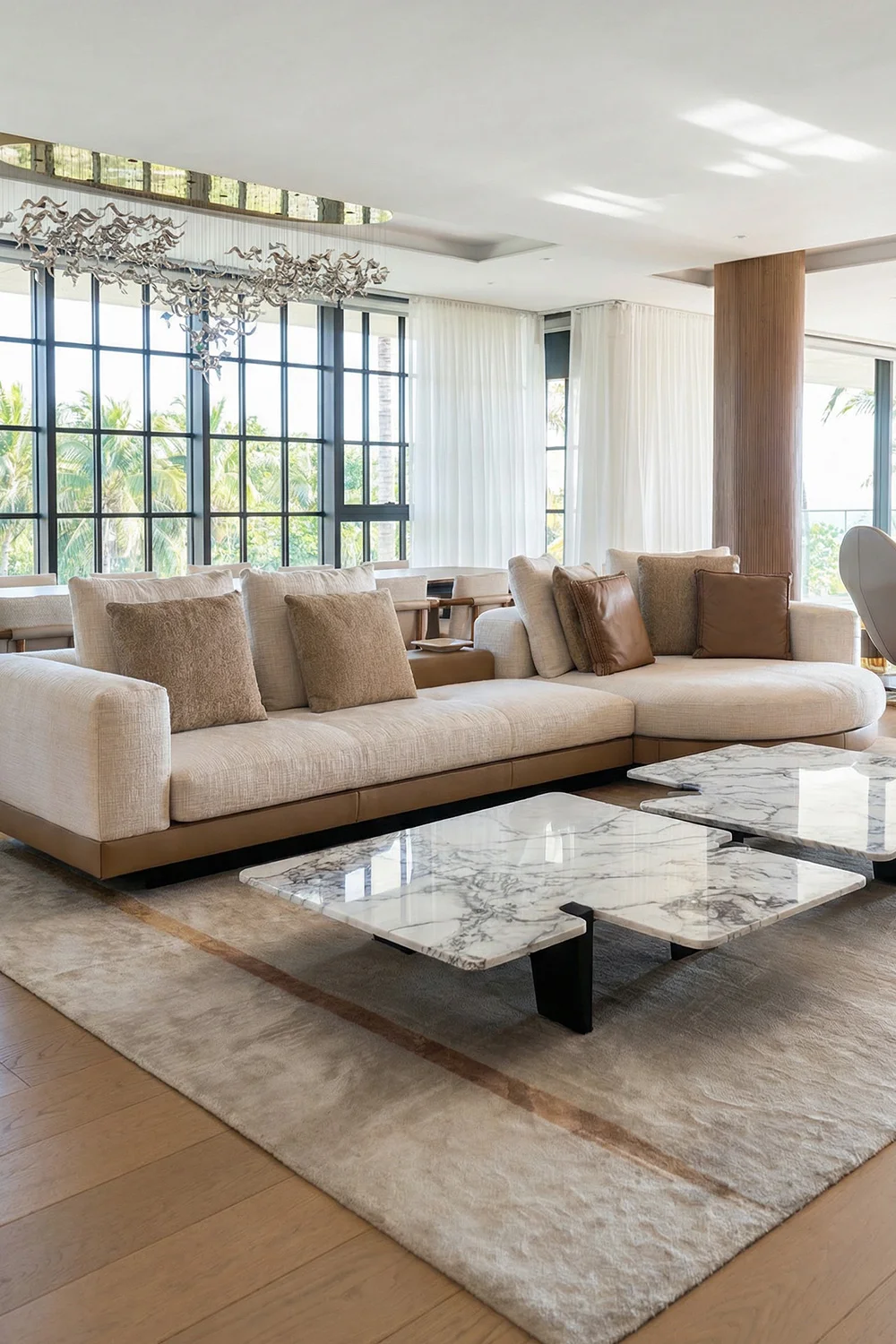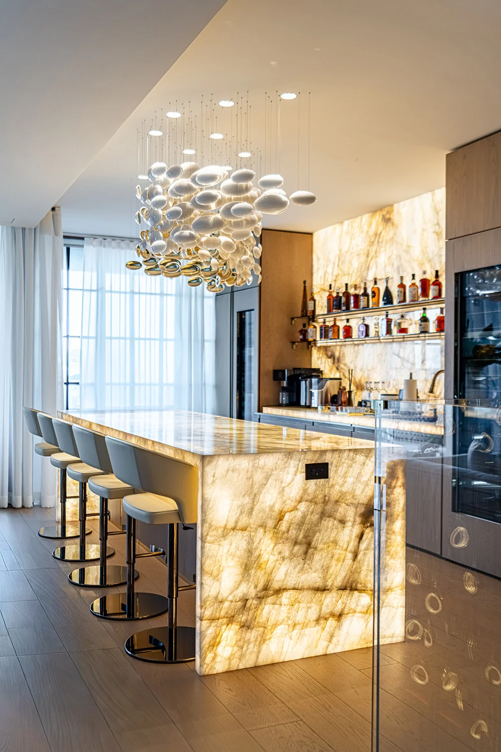 Rita Chraini unveils a full-scale renovation of a 7,000 sq ft penthouse at Artes Surfside, Miami—a residence where refined French sophistication is seamlessly blended with the serenity of oceanfront living. At the heart of the design lies a dramatic onyx bar with bespoke backlighting, creating a luminous focal point that anchors the main living space. Overlooking it, a handcrafted crystal chandelier by Sans Souci Lighting cascades gracefully through the staircase, functioning as both sculpture and light installation. Rita curated a selection of exceptional furnishings from Fendi Casa, Minotti by DDC, and Roche Bobois, shaping an interior that feels timeless, polished, and meticulously tailored. A standout moment is the iconic Louis Vuitton Cocoon hanging chair from the Objets Nomades collection—an avant-garde piece that introduces both artistry and movement, perfectly framing the penthouse's sweeping views of the Atlantic. The result is a residence of rare harmony—architectural precision, luxurious materials, and curated design elements brought together to create a coastal sanctuary of unmistakable elegance.