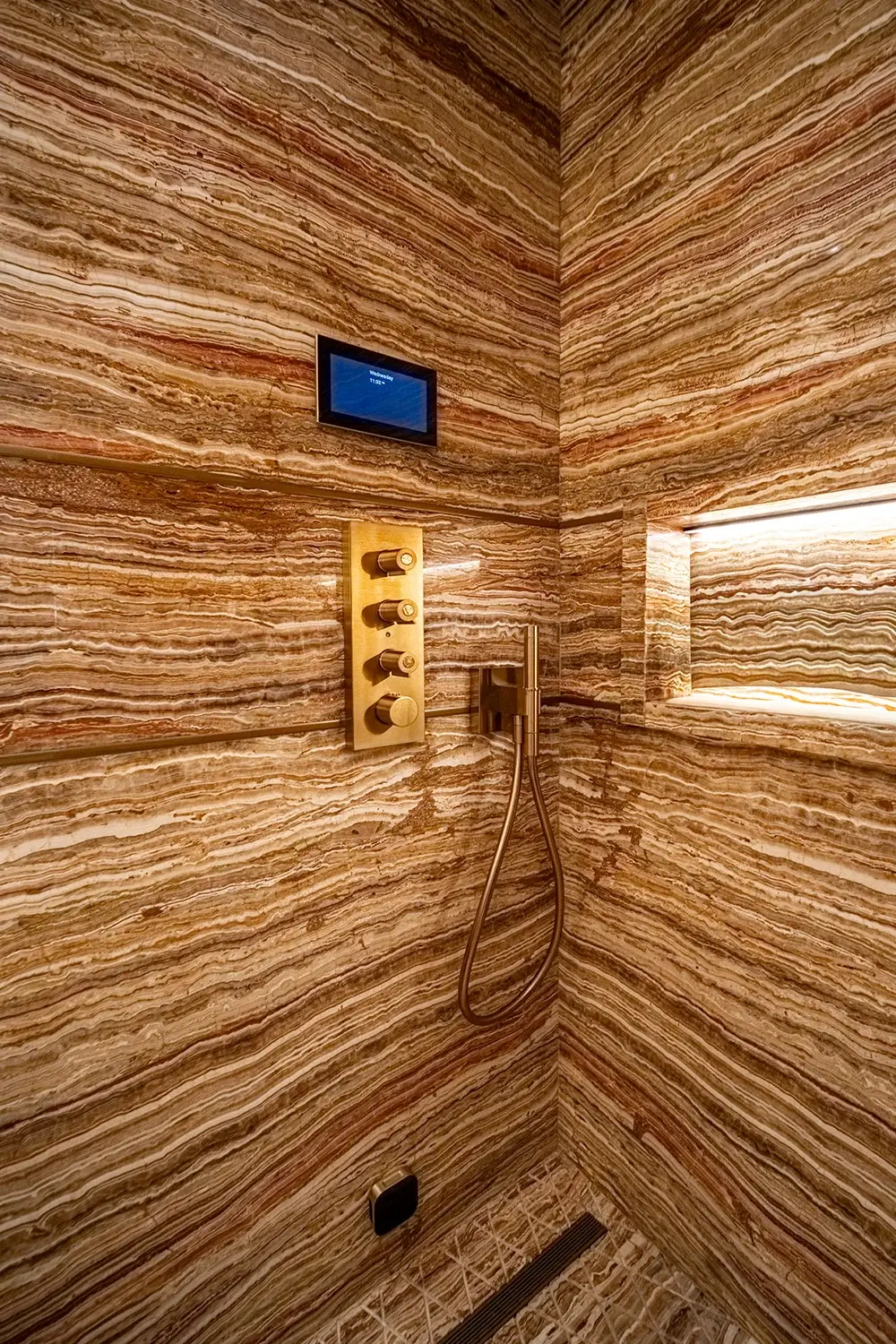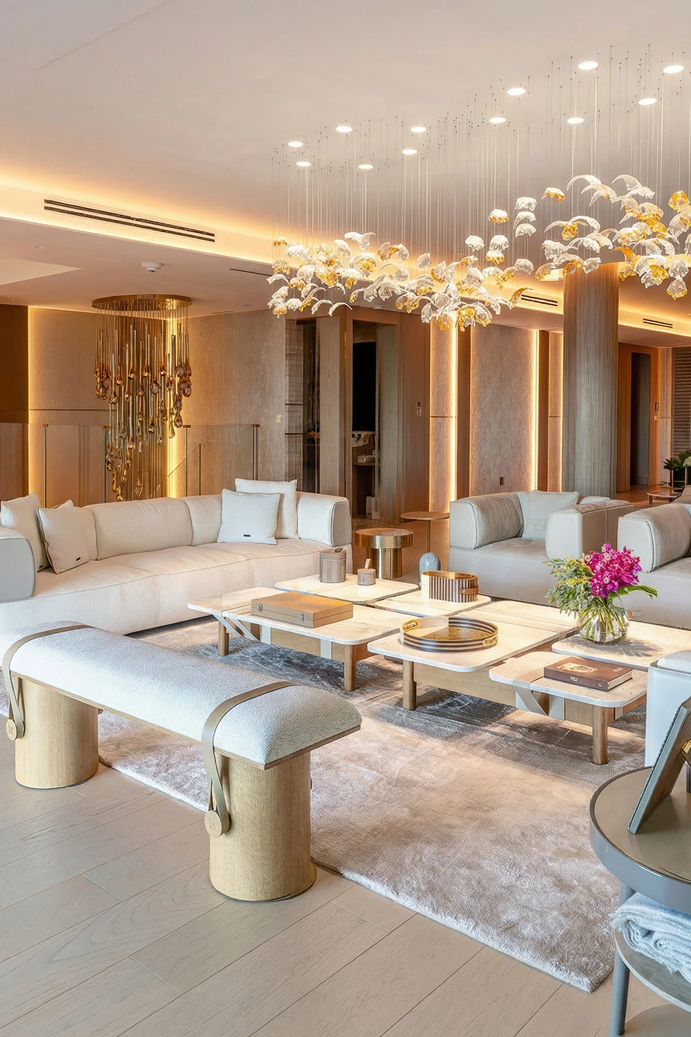 Rita Chraini unveils a full-scale renovation of a 7,000 sq ft penthouse at Artes Surfside, Miami—a residence where refined French sophistication is seamlessly blended with the serenity of oceanfront living. At the heart of the design lies a dramatic onyx bar with bespoke backlighting, creating a luminous focal point that anchors the main living space. Overlooking it, a handcrafted crystal chandelier by Sans Souci Lighting cascades gracefully through the staircase, functioning as both sculpture and light installation. Rita curated a selection of exceptional furnishings from Fendi Casa, Minotti by DDC, and Roche Bobois, shaping an interior that feels timeless, polished, and meticulously tailored. A standout moment is the iconic Louis Vuitton Cocoon hanging chair from the Objets Nomades collection—an avant-garde piece that introduces both artistry and movement, perfectly framing the penthouse's sweeping views of the Atlantic. The result is a residence of rare harmony—architectural precision, luxurious materials, and curated design elements brought together to create a coastal sanctuary of unmistakable elegance.